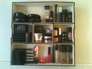 I needed a cheap way to organize my proud collection of colors and bring some order to half this ish that I never use. That, and the psychological impetus to not SET FOOT again in a Sephora/Ricky’s/MAC/NARS/Chanel counter until 50% of this stuff is actually used.